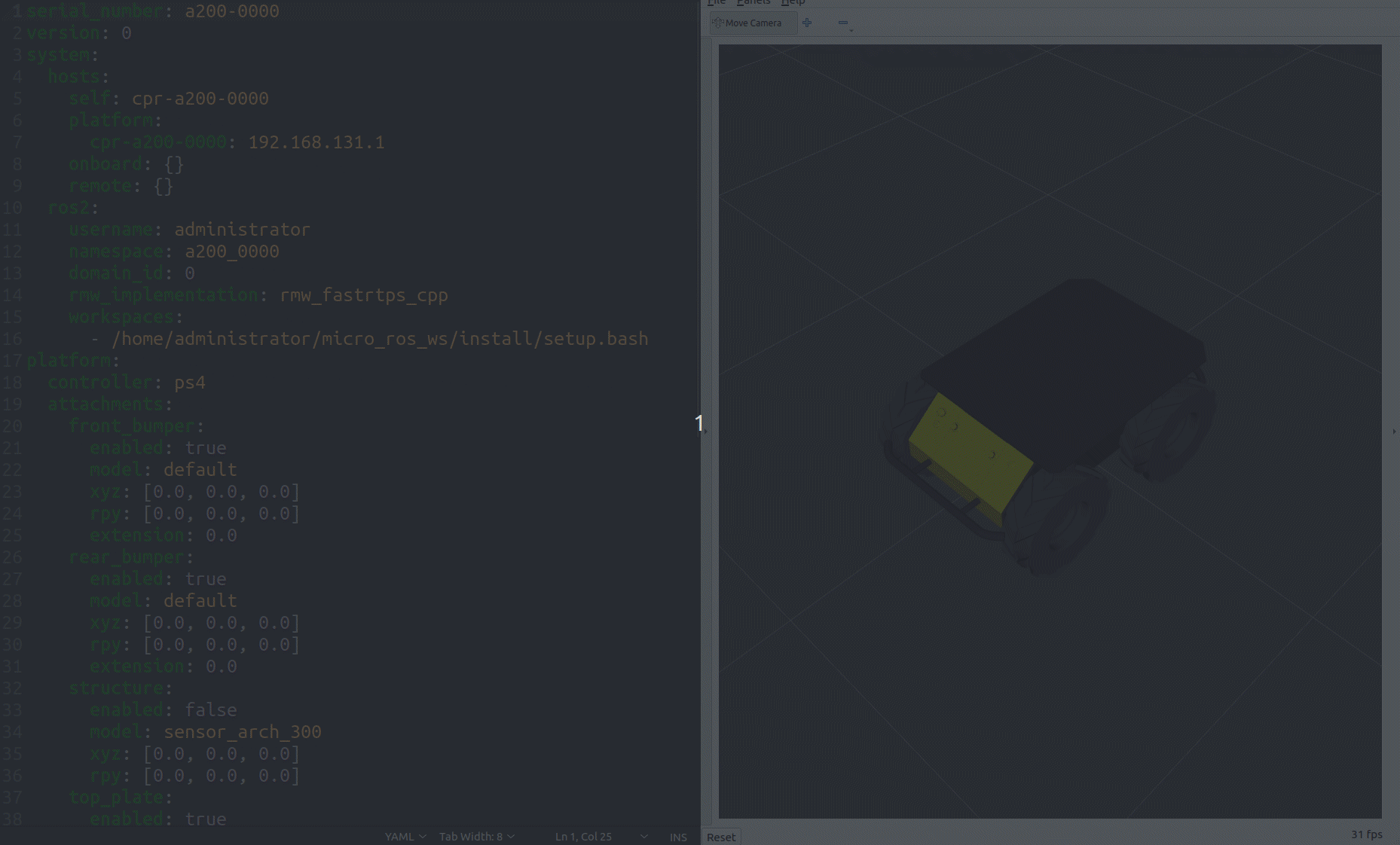 Starting off with the default A200 Husky YAML, we switch the top plate, add the sensor arch, a fath pivot mount, and finally a RealSense. Every time we want changes to take effect, we save the file. If after saving no changes take place, then it's an indication that these were invalid.
