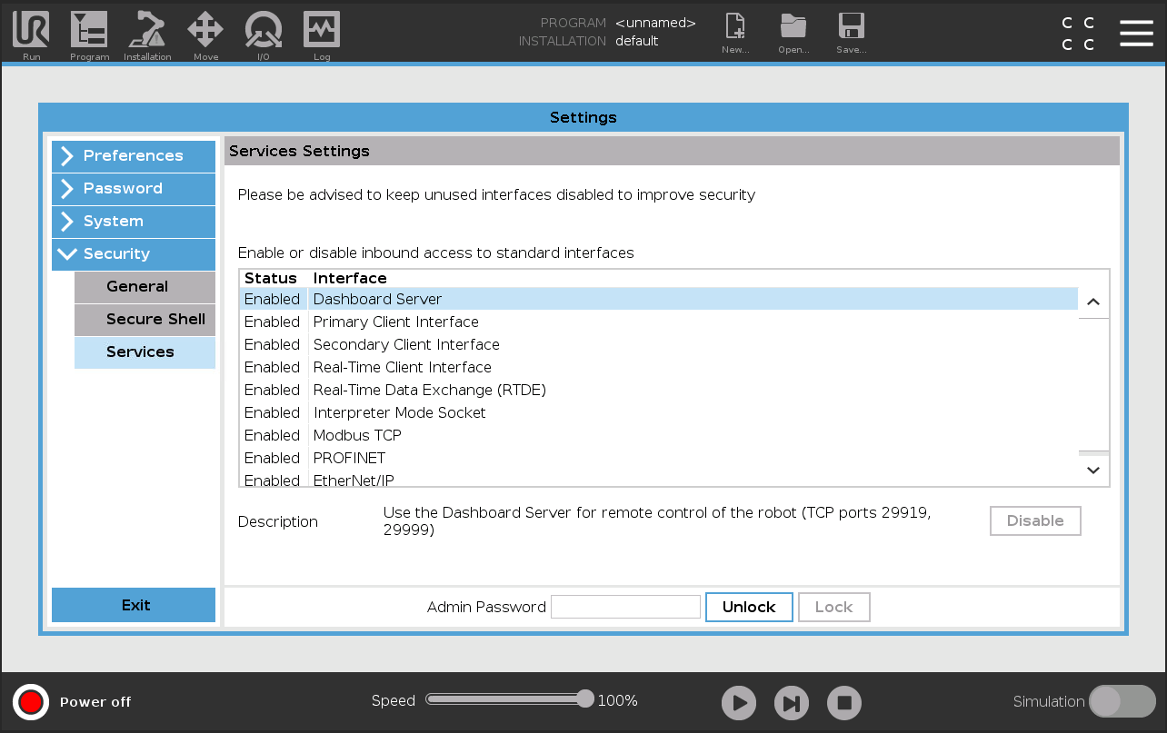 In recent versions of the UR control box firmware, the services required to start external control must be enabled manually through the teach pendant. Under the Settings page, find the Security tab. There should be a Services section under the Security tab. Enable the Dashboard Server, Primary Client Interface, and Real-Time Data Exchange (RTDE) interfaces.