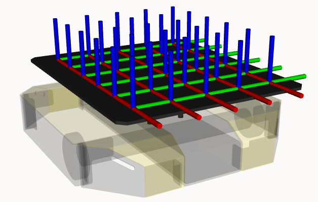 Attach accessories to the top plate mounts by setting the accessory's parent parameter to one of the grid mounting locations displayed above. The grid mounting locations span from top_plate_mount_a1 to top_plate_mount_e6, where the front left-most location is the a1 mount and the bottom right-most location is the e6 mount. The letters correspond to the columns and the number to the rows. The name of these links depends on the name parameter defined in the entry above.