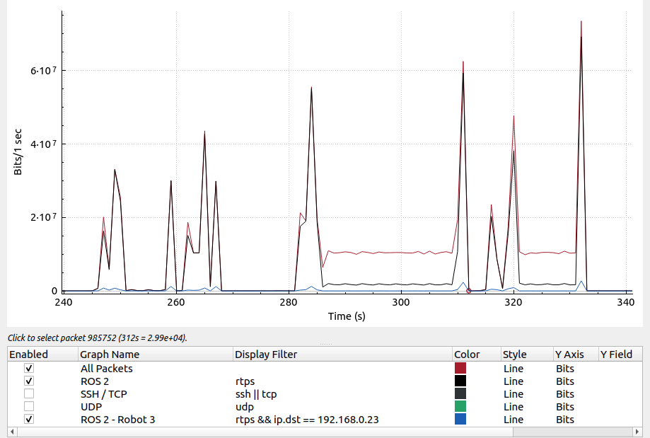 In addition to the display filters, take note of the y-axis (bits vs packets) to determine what data is graphed. The Interval setting at the bottom of the window (not shown) controls the timeframe over which each datapoint is calculated.