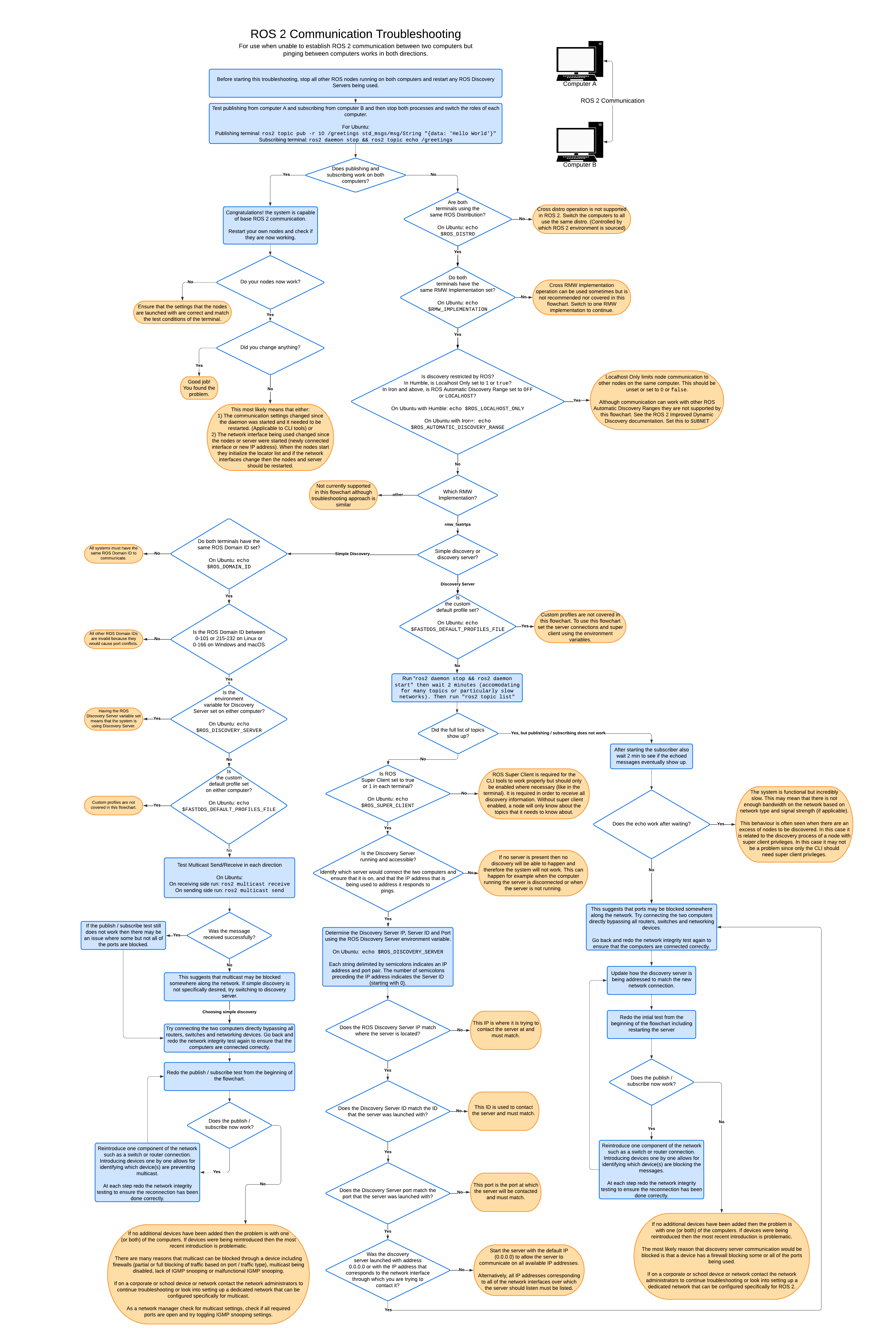 The first step for troubleshooting ROS 2 connectivity between two computers is to investigate Network Integrity. Once network integrity is confirmed, the next step is to troubleshoot being able to publish and subscribe to ROS topics. The following flowchart covers the most common networking errors in Fast DDS. Many of these concepts are transferrable to other DDS implementations. Click on the image below to open in a new tab and explore the troubleshooting steps.