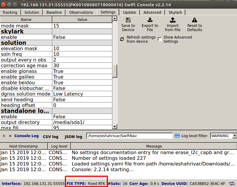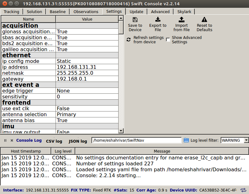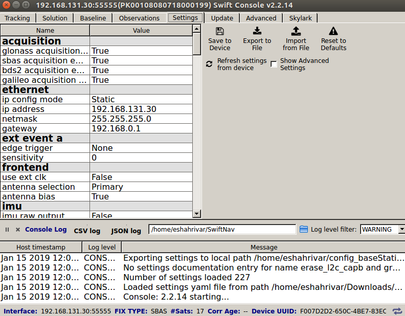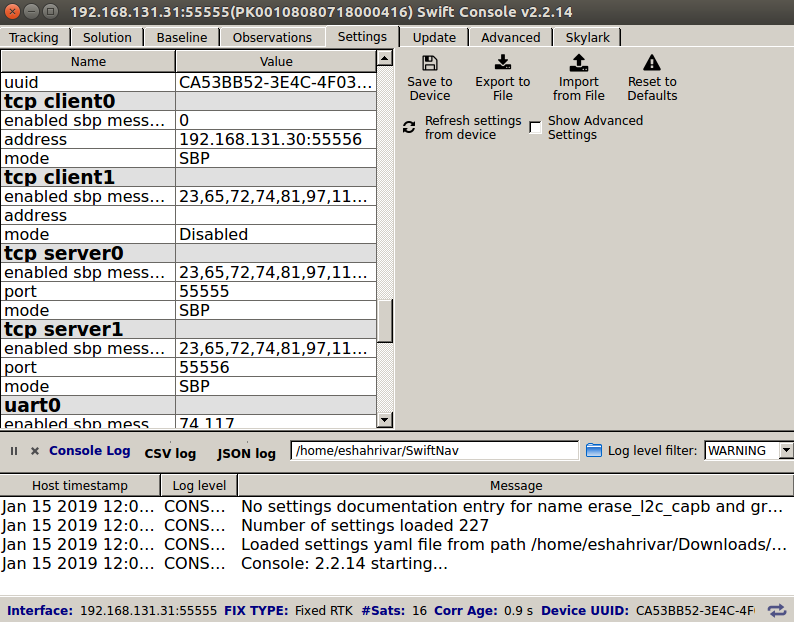 Use the Swiftnav console to connect to the Reference Receiver (with IP address of 192.168.131.31) and insert the settings shown in the figure below.