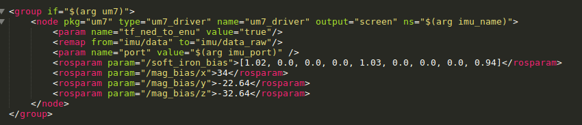 8. Once there are enough red points on your fitted ellipsoid, enter the above calibrations in the IMU driver launch file. Open the sensor.launch file in the cpr_gps_localization package and go to the UM7 (or UM6) section of the launch file. The figure below shows this section for the UM7.
