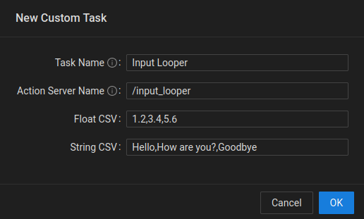 • Float CSV: A list of comma seperated float values that consist of the numerical inputs to the custom task.