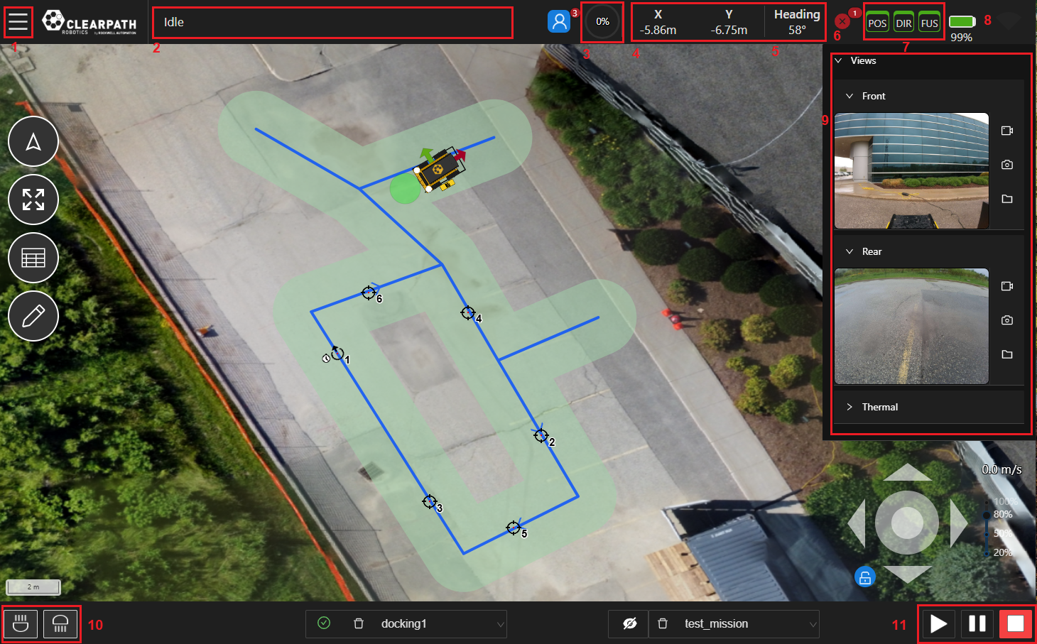 7. GPS Status Indicator: The GPS status indicators will display GPS signal accuracy for position (POS indicator), heading (DIR indicator), and sensor fusion (FUS indicator). Green indicators represent RTK accuracy and are currently required for accurate autonomous navigation. Yellow and orange indicators represent SBAS and SPP accuracy respectively and noticeable oscillations may occur in such cases. Red indicators mean no GPS signal and autonomous navigation missions should not be started.