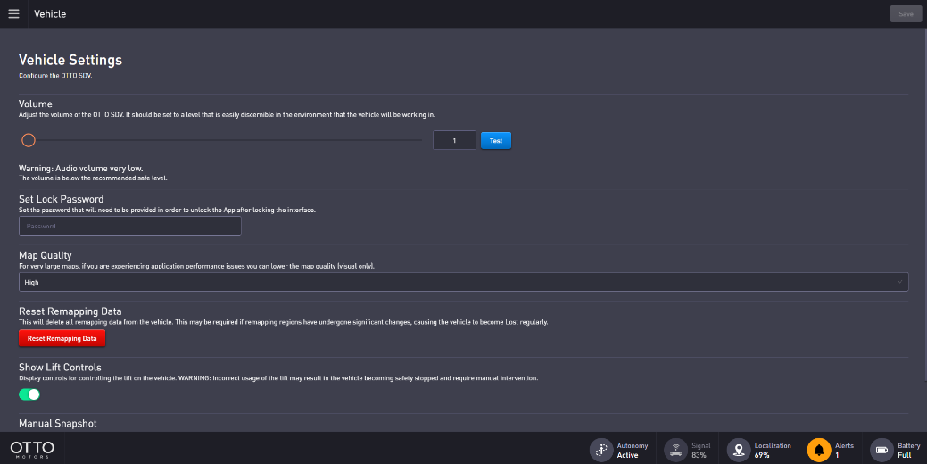 - Adjust the volume to an appropriate level for your facility by selecting the Vehicle option from the top-left menu and adjusting the volume as appropriate.