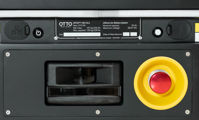 In addition to the rear emergency stop button described in the HMI Panel above, Boxer 2.5 (but not Boxer 2.4) has a front emergency stop button, which is mounted to the right of the front safety LiDAR. Refer to Emergency Stop Buttons for additional details.