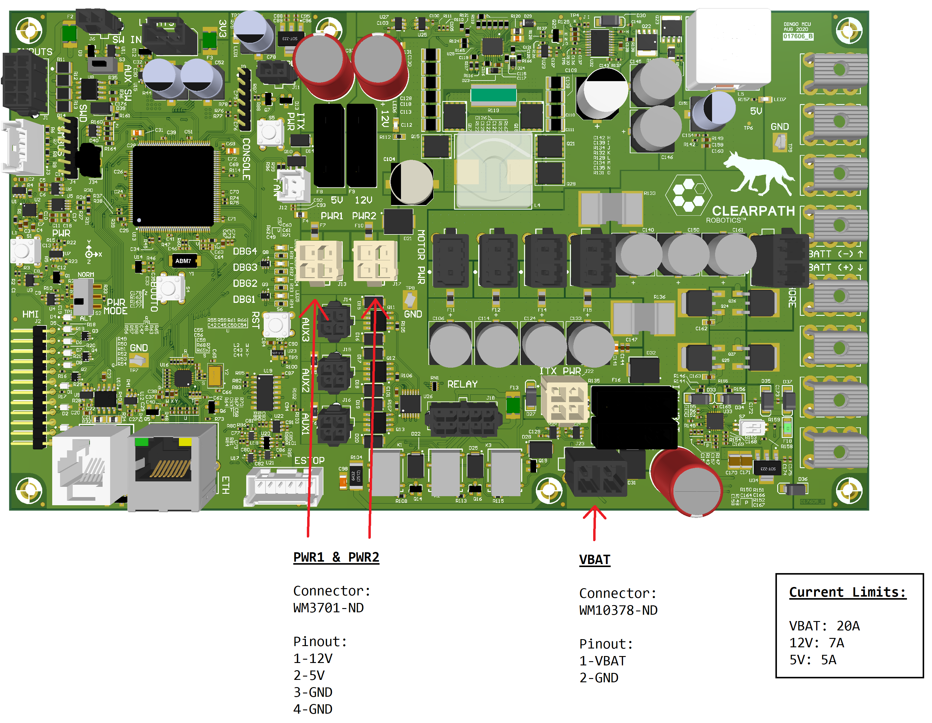| PWR1, PWR2 | Dingo 1.0: Molex 0039301040 Dingo 1.5: Molex 0039302040 | Dingo 1.0: Molex 0039012040 Dingo 1.5: Molex 0039014041 | Molex 0507528200 (AWG 20-22) or Molex 0503518100 (AWG 22-28) | Molex 2002184900 |