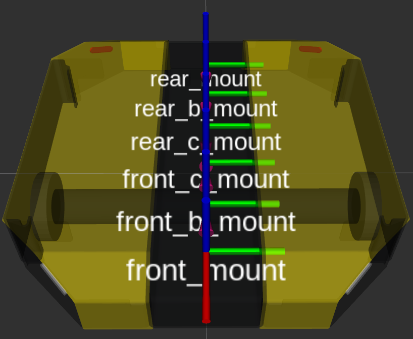 Dingo-D has 6 evenly-spaced mounting points along its center channel for mounting sensors and other accessories. Dingo-O has 7 similar mounting points. The centers of these mounting points are represented as links in the URDF to facilitate adding sensors to simulated robots and modelling collisions when planning arm motions for mobile manipulation.