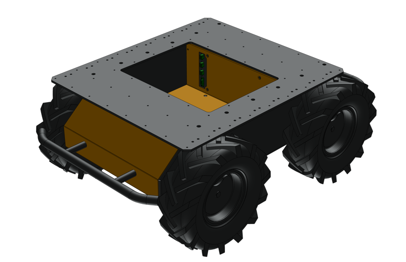 This simplified 3D model of the Husky A200 includes details like the internal battery, circuit board where you can connect to the robot's electrical provisions, chassis, wheels, and different top attachment structures.