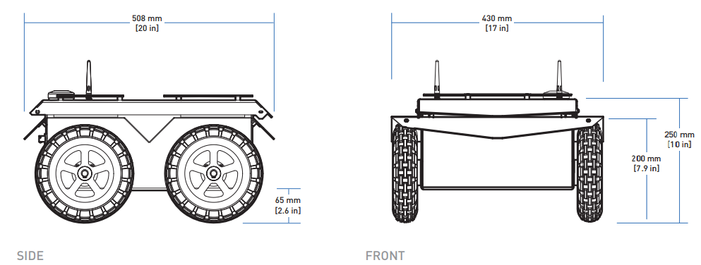| Internal Sensing | Battery Status, Wheel Odometry, Motor Currents, Onboard IMU, Onboard GPS |